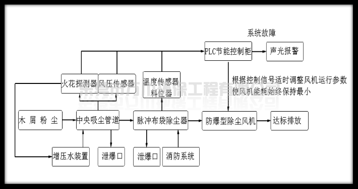 2)風(fēng)機(jī)在除塵器末端,避免木料中的金屬物通過管道直接吸入風(fēng)機(jī)中,將與風(fēng)葉摩擦的火花吹進(jìn)布袋除塵器中,導(dǎo)致安全隱患。